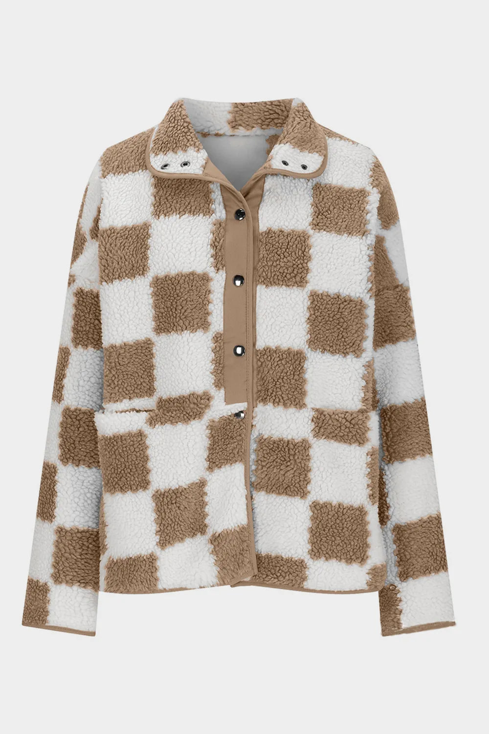 Checkered Snap Down Long Sleeve Teddy Jacket